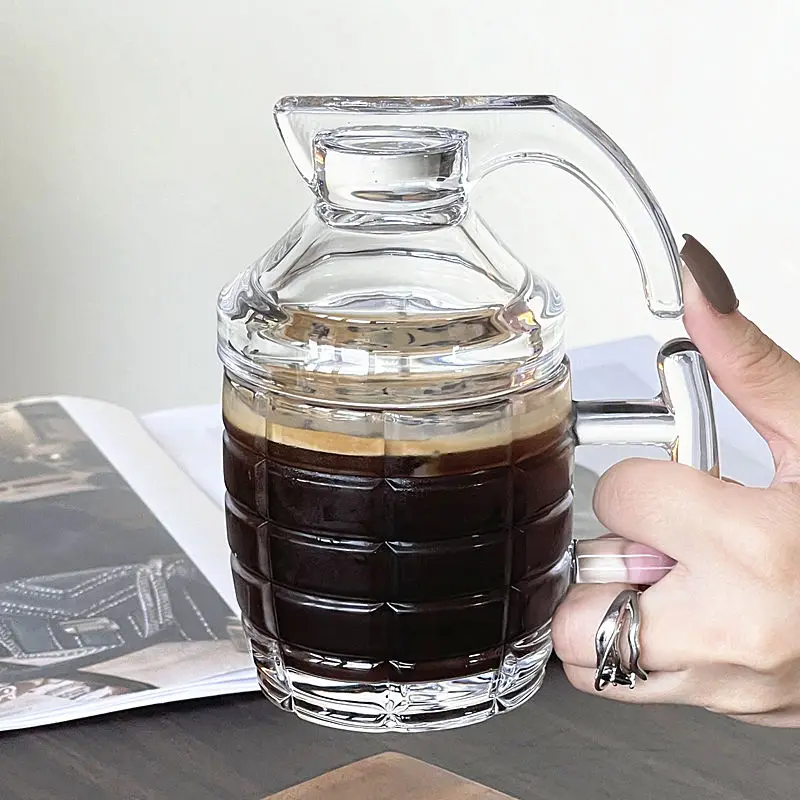 Make a bold statement with this funny grenade-shaped glass coffee mug. Designed with a handle and lid for convenience, it’s perfect for coffee, tea, beer, milk, or cocktails. The creative transparent design adds a touch of humor and uniqueness to your drinkware collection.